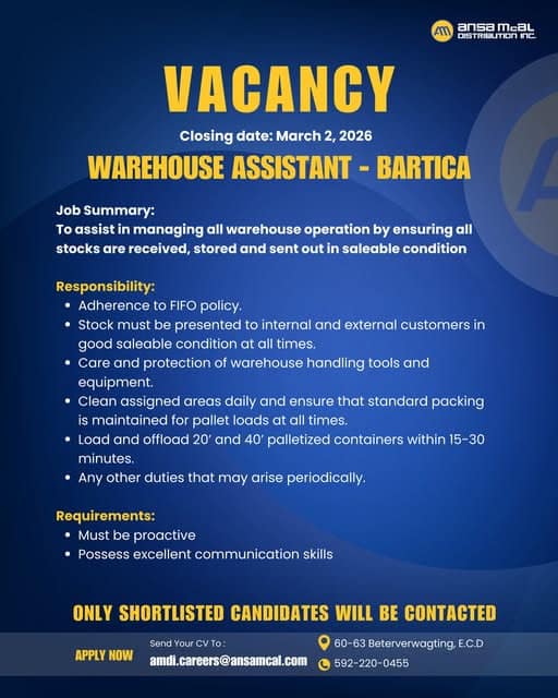 ANSA MCAL DISTRIBUTION INC. Hiring Warehouse Assistant – Bartica
