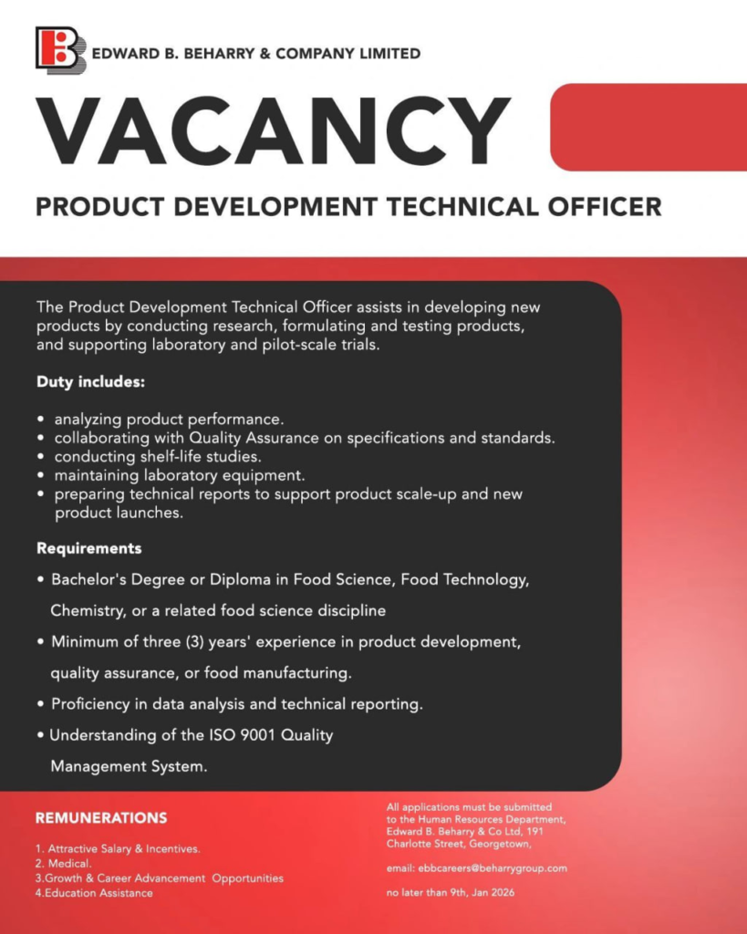 Apply now and advance your career in food science with Edward B. Beharry & Company Limited!