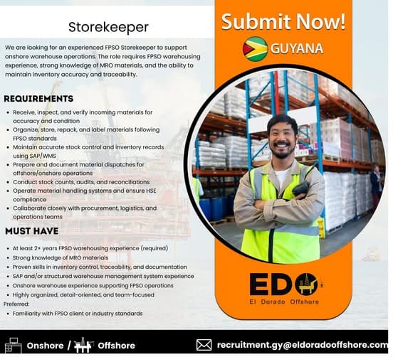 We are looking for an experienced FPSO Storekeeper to support onshore warehouse operations. The role requires FPSO warehousing experience, strong knowledge of MRO materials, and the ability to maintain inventory accuracy and traceability.