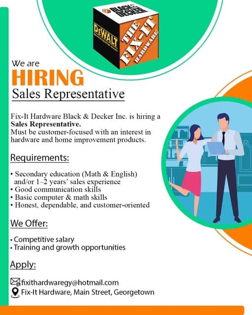 Fix-It Hardware Black & Decker Inc. is seeking a motivated and customer-focused Sales Representative to join our team. If you have a passion for hardware and home improvement products and enjoy helping customers find the right solutions, this is the perfect opportunity for you!