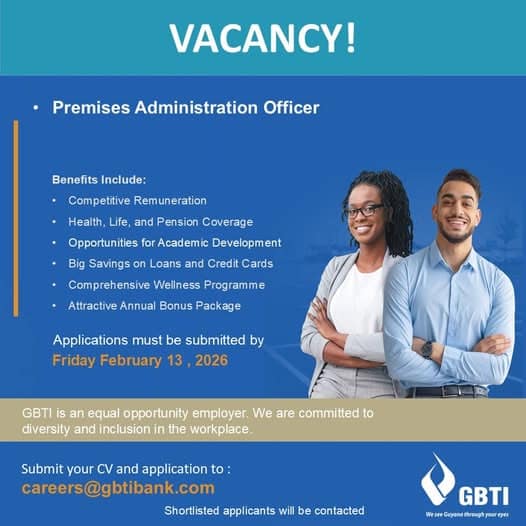 GBTI is seeking a dedicated and organized Premises Administration Officer to join our team. This is an excellent opportunity to be part of one of Guyana’s leading financial institutions and play a key role in maintaining and managing our premises.