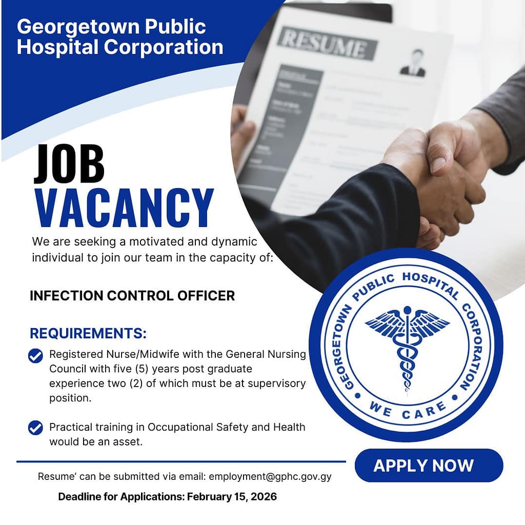 Georgetown Public Hospital Corporation is seeking a motivated and dynamic individual to fill the critical role of Infection Control Officer. This is a senior position that plays a vital part in maintaining patient safety and preventing the spread of infections within one of Guyana’s most important healthcare facilities.