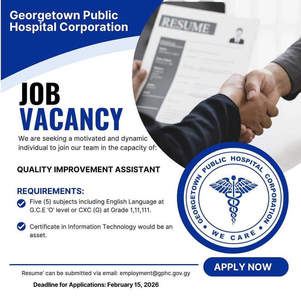 Georgetown Public Hospital Corporation is seeking a motivated and dynamic individual to join our team as a Quality Improvement Assistant. This is an exciting opportunity to contribute to enhancing the standards and delivery of healthcare services at one of Guyana’s premier healthcare facilities.