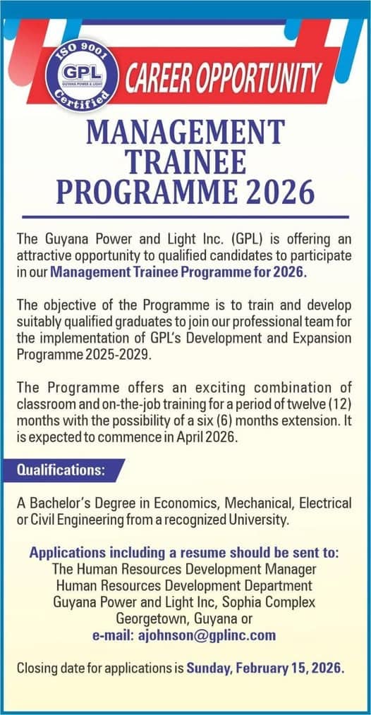 The Guyana Power and Light Inc. (GPL) is offering an attractive opportunity to qualified candidates to participate in our Management Trainee Programme for 2026.