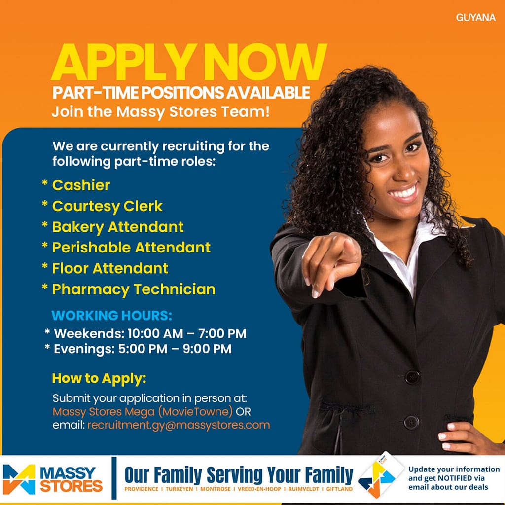 Submit your application in person at Massy Stores Mega (MovieTowne) OR email: recruitment.gy@massystores.com