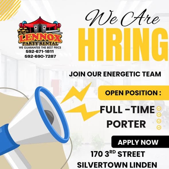Lennox Party Rental is looking for a hardworking, reliable individual to join our dynamic team. If you’re ready to work in a fast-paced environment and be part of Guyana’s premier party rental service, we want to hear from you!