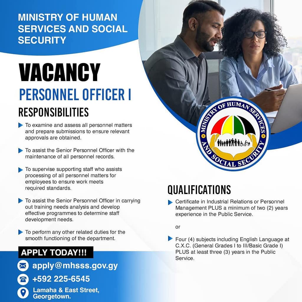 The Ministry of Human Services and Social Security is seeking a dedicated Personnel Officer I to join our Human Resources team. This is an excellent entry-level supervisory opportunity for individuals looking to develop their career in personnel management within the public sector.