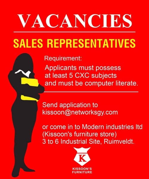 Kissoon’s Furniture is inviting applications for the position of Sales Representative.