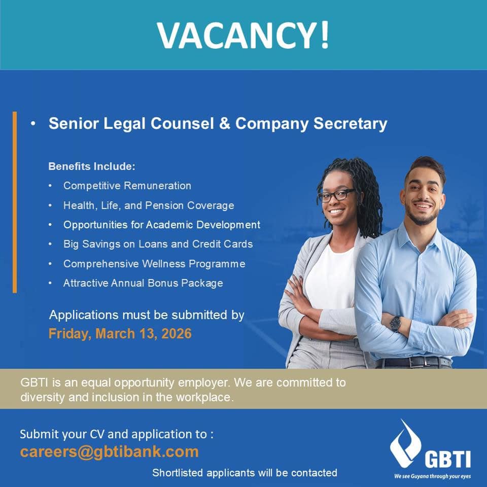 GBTI invites applications from suitably qualified individuals for the position of Senior Legal Counsel & Company Secretary.