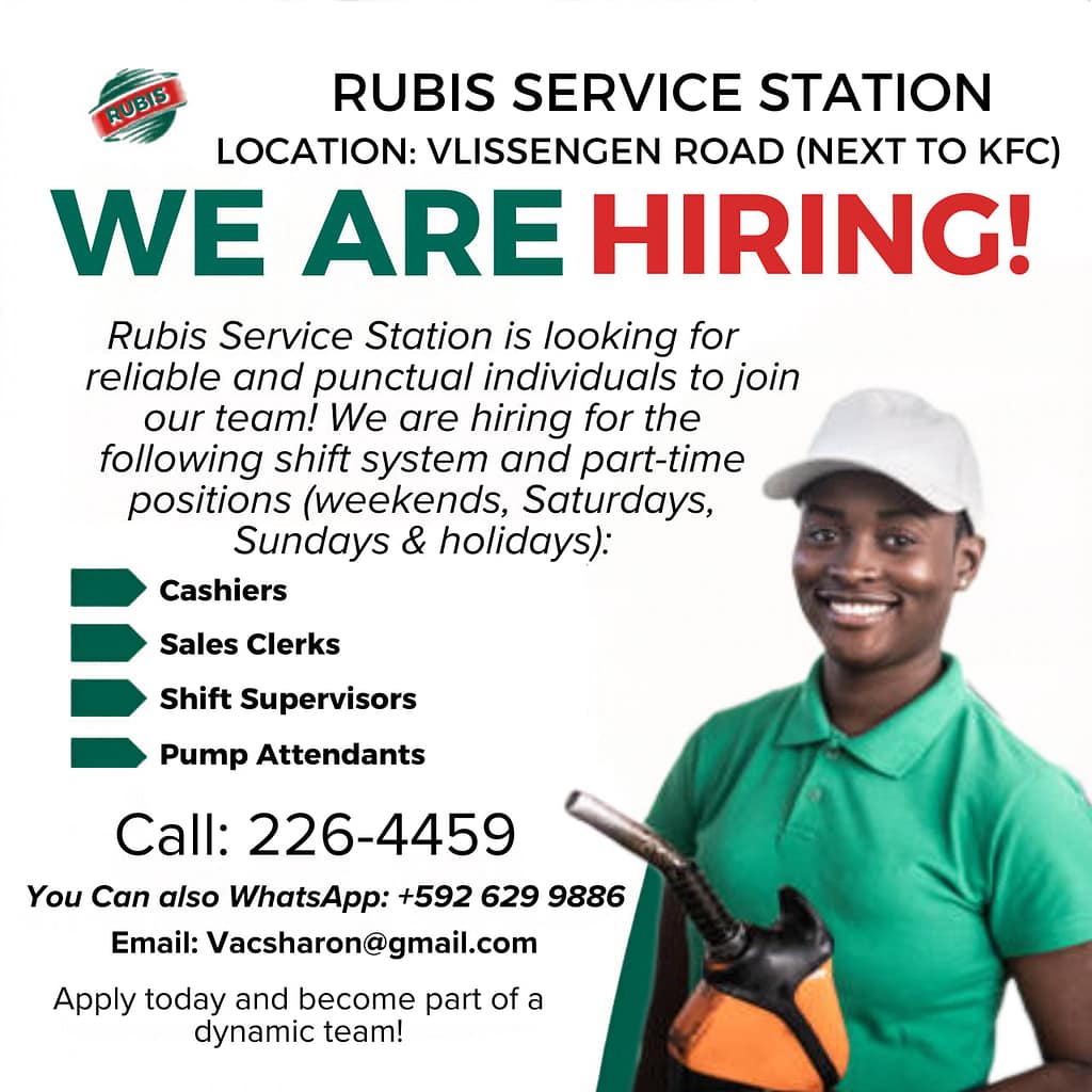 Looking for a job? Rubis Service Station on Vlissengen Road (next to KFC) is now hiring reliable and punctual individuals to join the team.
