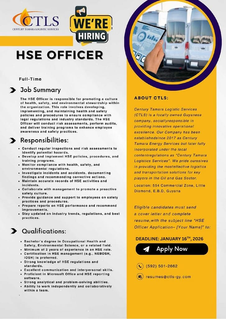 Century Tamara Logistic Services (CTLS) is seeking a qualified and motivated HSE Officer to join our growing team.